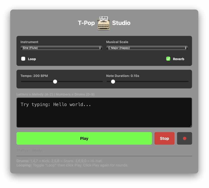 T-Pop is an experimental browser-based synthesizer that performs a process called "sonification." It takes input data – in this case, the letters and symbols you type – and maps them onto a musical scale.
